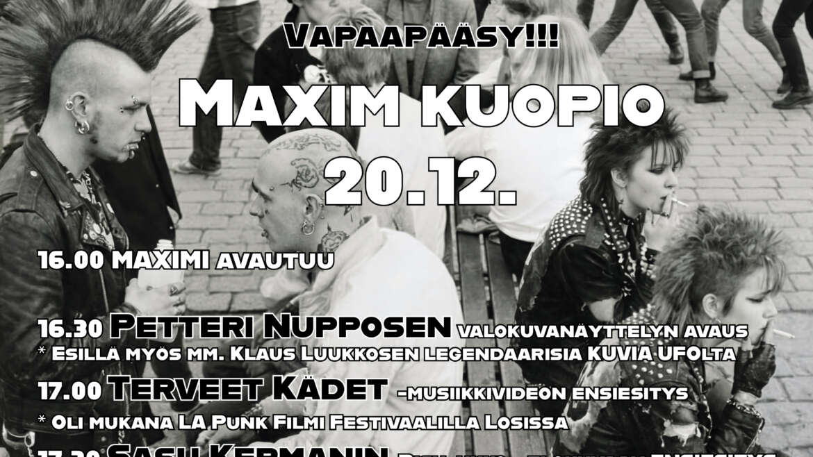 Kuopio Punk – valokuvanäyttelyn avajaisia vietettiin Maximissa 20.12. Petteri Nupposen valokuvanäyttelyn lisäksi avajaisissa esitettiin ensi-illassa Sasu Kermanin elokuva Risu-Ukko. Tämän lisäksi valkokankaalla näytettiin Terveet Kädet -yhtyeen musiikkivideo, joka valittiin LA Punk Film Festivalille. Video on kuvattu Kiuruveden Peltohovissa, ja sen toteutusta on tukenut Kiuruveden kaupunki. Joulukuun tapahtuma keräsi runsaasti kiinnostuneita kävijöitä Maximiin. Illan kruunasi Terveet…