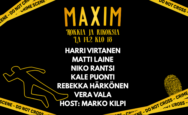 Rokkia ja rikoksia tapahtuman pääajatus on nostaa esille suomalaisen rikoskirjallisuuden parhaimmistoa yhdistäen perinteinen kirjallisuustapahtuma ja menevä live-musiikki. Rokkia ja Rikoksia-kirjallisuustapahtuma järjestetään nyt jo 5. kerran Ohjelmaravintola Maximissa, mitä oivallisimmissa puitteissa ja tällä kertaa kirjailijavieraina ovat Harri Virtanen, Niko Rantsi, Matti Laine, Kale Puonti, Rebekka Härkönen ja Vera Vala.
