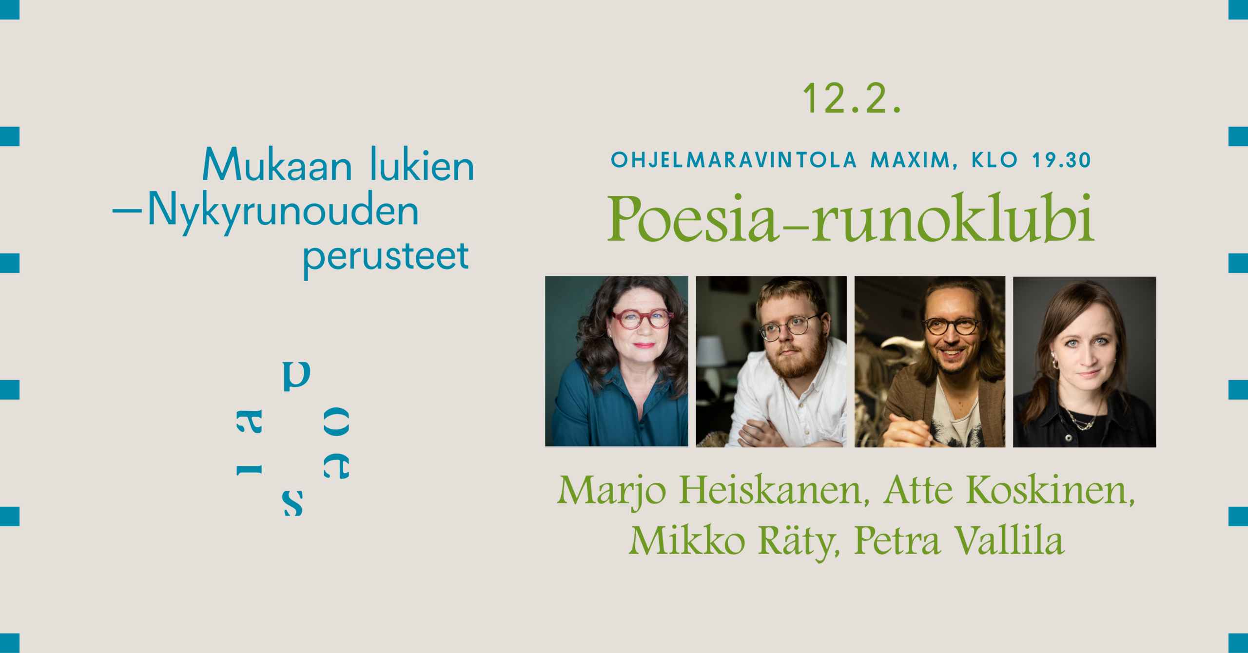 Luvassa runoutta kuopiolaistaustaisilta runoilijoilta Marjo Heiskaselta ja Mikko Rädyltä sekä Atte Koskiselta ja Petra Vallilalta, illan aikana kuullaan otteita myös kevään uutuusteoksista. Tilaisuuteen on vapaa pääsy, tervetuloa!