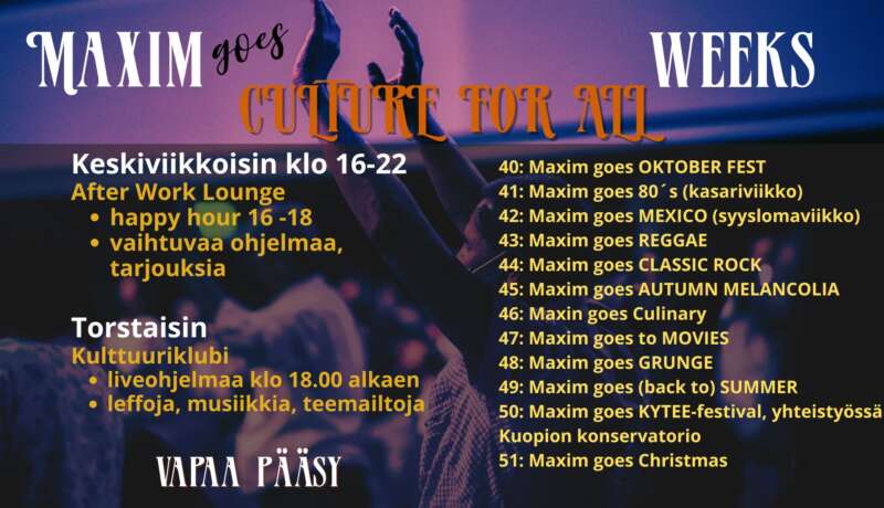 Maximin syyskauden ohjelmiston musiikkigenre tulee olemaan monipuolinen sisältäen myös pop, indie, punk, rap ja iskelmämusiikkia. Tuttuun tapaan Maximin syyskauteen mahtuu musiikin lisäksi myös Stand Up -komediaa, burleskia (Salaisuuksien Yö 1.11.) sekä uutena tapahtumana 31.10. TV:sta tuttu Pulkkinen Live Show ja 5.11. Heli Laaksosen Sukkela runoehtoo Ilonhilaaja -runoilta, jotka kaikki ovat myös mainiota ohjelmistoa esimerkiksi pikkujoulusesongin illanviettoihin.