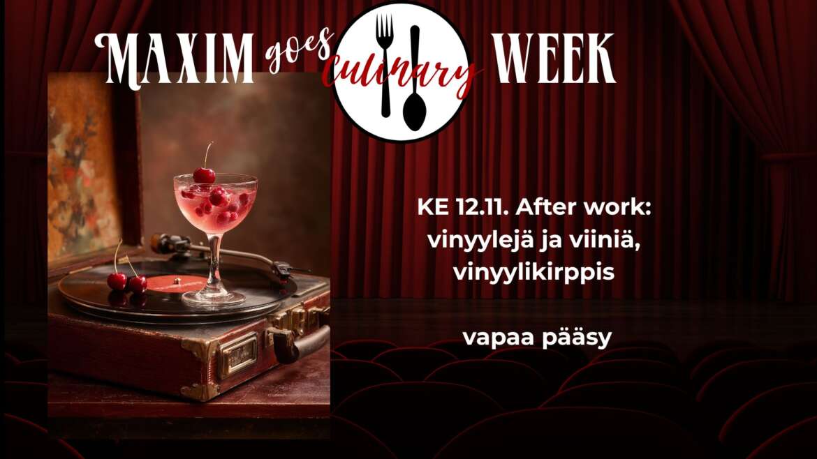 Maximin Afterwork Loungessa ollaan tällä viikolla viikkoteeman mukaan kulinaristisissa tunnelmissa. Viinejä ja viinyylejä -illassa voit tulla maistelemaan ihania syksyn viinejä sekä kuuntelemaan vanhoja vinyylejä.