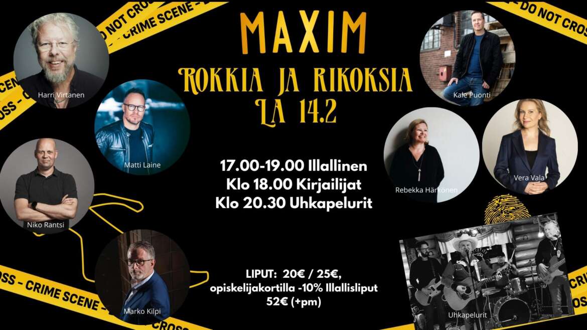 Rokkia ja rikoksia tapahtuman pääajatus on nostaa esille suomalaisen rikoskirjallisuuden parhaimmistoa yhdistäen perinteinen kirjallisuustapahtuma ja menevä live-musiikki. Rokkia ja Rikoksia-kirjallisuustapahtuma järjestetään nyt jo 5. kerran Ohjelmaravintola Maximissa, ja tällä kertaa kirjailijavieraina ovat Harri Virtanen, Niko Rantsi, Matti Laine, Kale Puonti, Rebekka Härkönen ja Vera Vala. Tilaisuuden isäntänä ja tilaisuuden promoottorina toimii pitkän linjan kuopiolainen rikoskirjailija Marko Kilpi.…